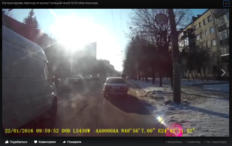 "На пішохідному переході по вулиці Галицькій водій AUDI збив пішохода. ДТП на відеореєстратор зняв Олександр Дунаєвський", - зазначено у дописі.