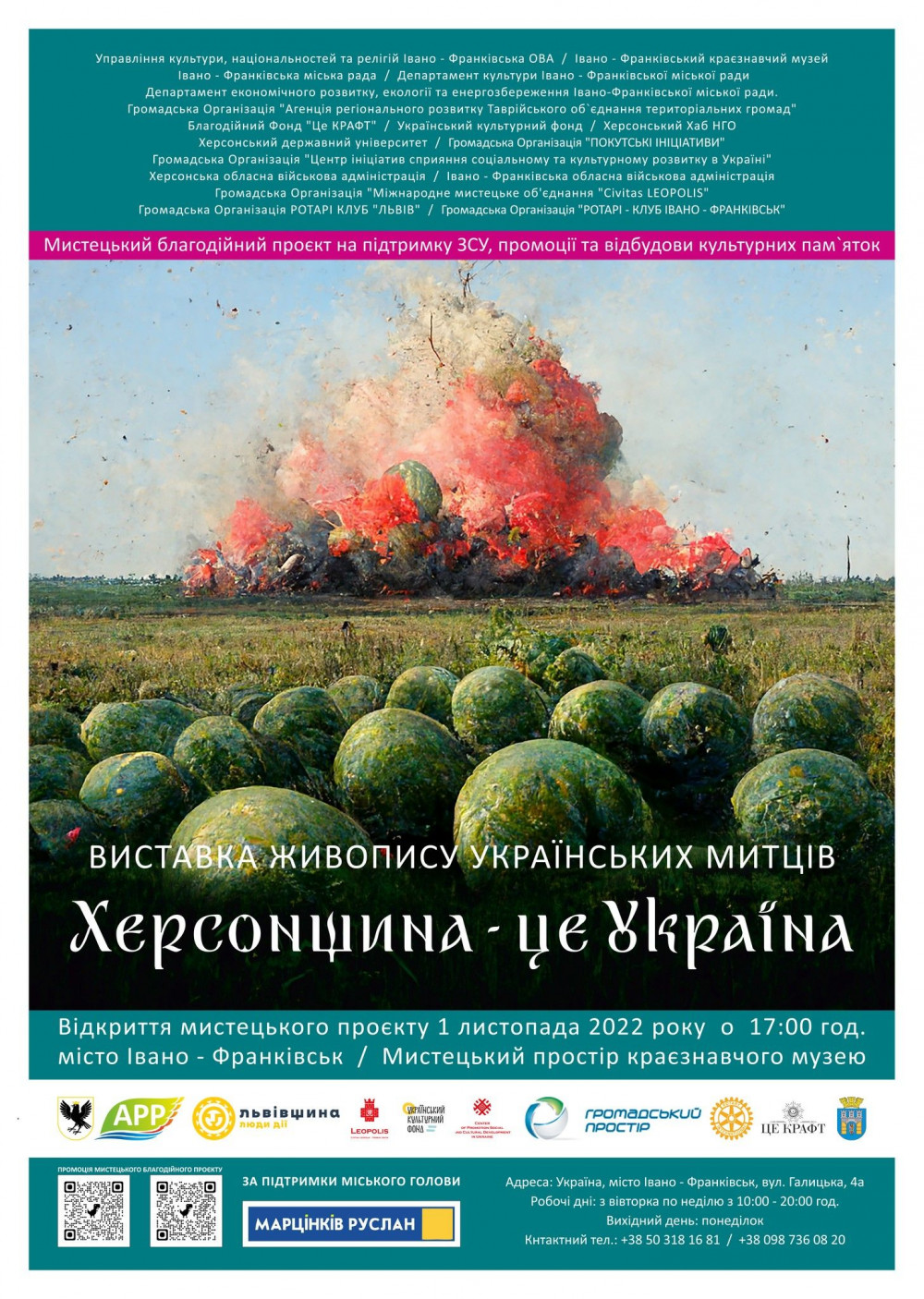 1 листопада о 17:00 в Івано-Франківському краєзнавчому музеї відбудеться урочисте відкриття виставки «Херсонщина – це Україна». Після відкриття буде проходити благодійний аукціон картин для підтримки ЗСУ.