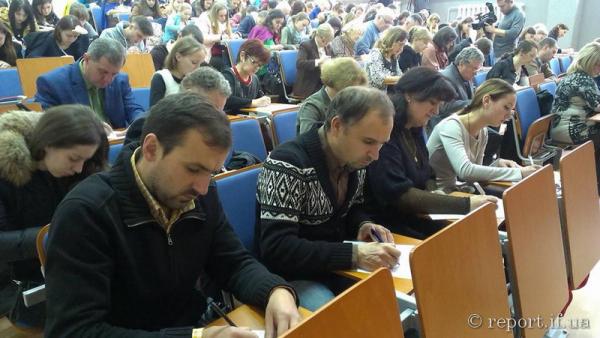 Письменники, викладачі, директор Івано-Франківської обласної філармонії Василь Тимків і керівник драмтеатру Ростислав Держипільський разом зі студентами сіли за парти і писали ”Диктант єдності”. Це – традиційна акція до Дня писемності.