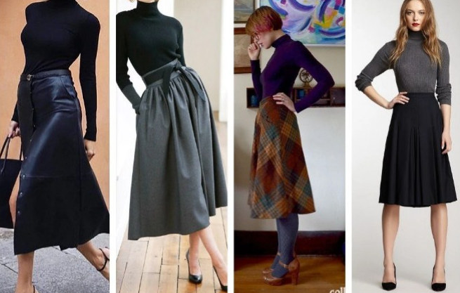 Ніжний жіночний образ вийде з широкою спідницею нижче коліна й гольфом. Тканину для спідниці краще вибрати не щільну, наприклад, тонку вовну, яка створює м'які складки.