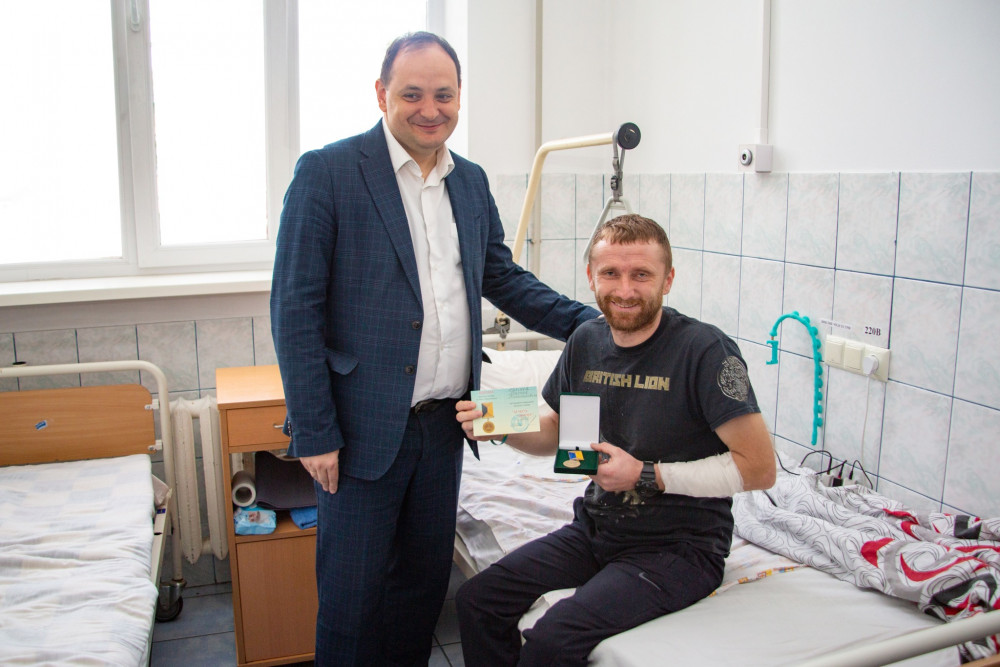 "Відвідав нашого бійця Василя Голінея (Франика) в лікарні. Він отримав поранення, коли віз побратимів на фронті і авто потрапило під обстріл. Зараз Василь лікується та відновлює сили. З приємністю вручив Герою нагороду«За честь і звитягу». Щиро бажаю швидкого одужання!",- йдеться в дописі.