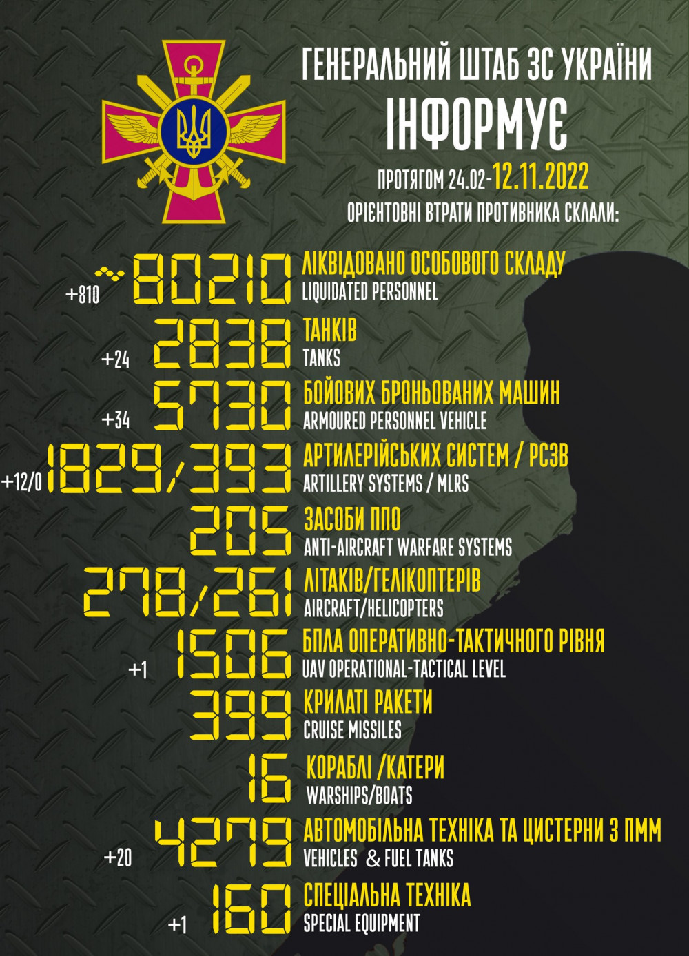 Загальні бойові втрати противника з 24.02 по 12.11 орієнтовно склали:
