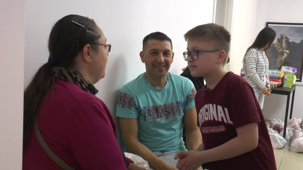 У волонтерському домі "Спільноти святого Егідія" 9-річний Максим пропонує вимушеним переселенцям смаколики, а також роздає їм продуктові набори.
