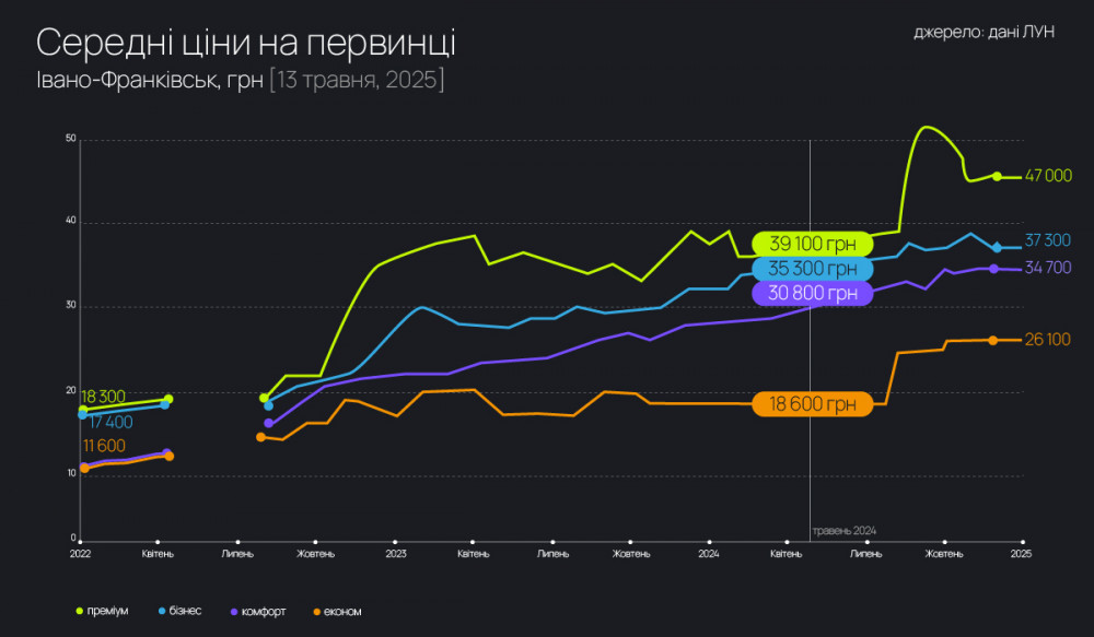 На середину травня 2025 року середня вартість первинки становить 35 700 грн/кв. м, за даними ЛУН.