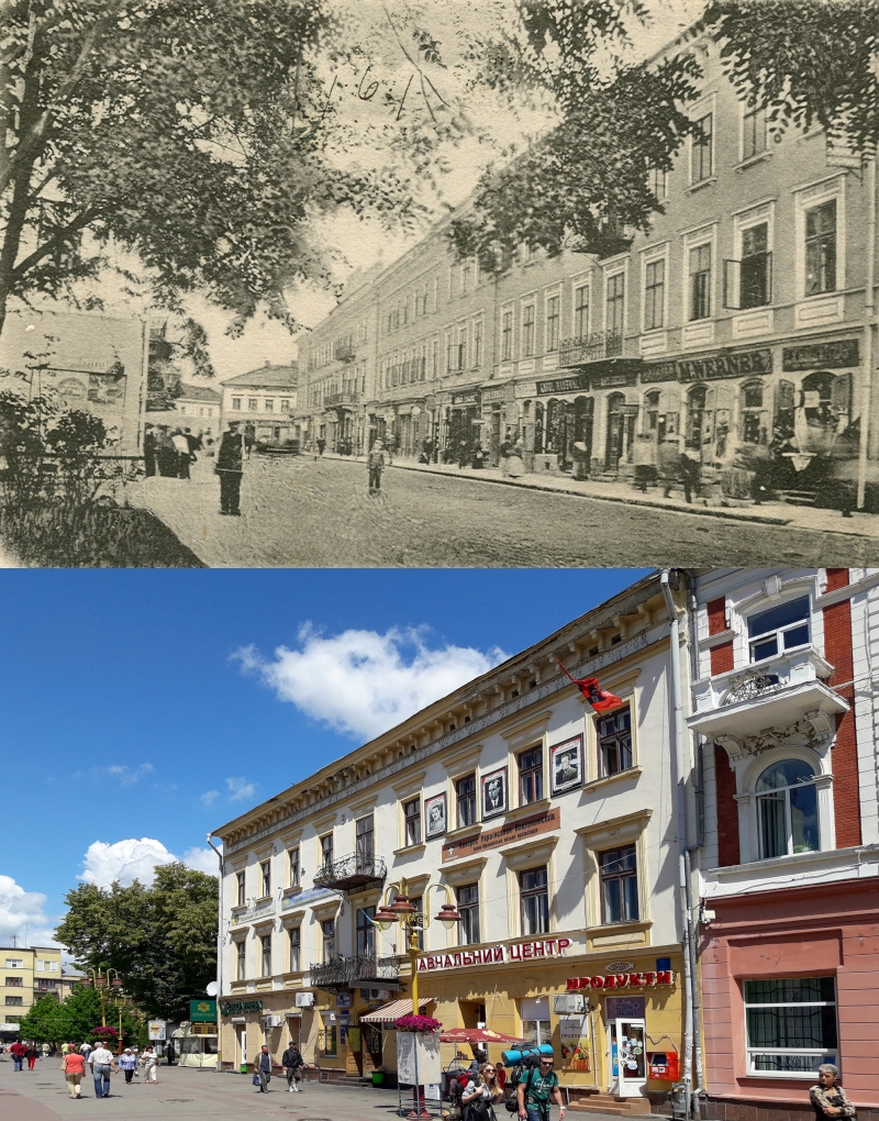 І хоча кам’яниця з австрійських часів мало змінилась, її важко впізнати з першого погляду. На старій поштівці ліворуч видно цілий квартал, а тепер там пустка. Сусідні будинки знищили в часи Першої світової, а от екс-оселя Худерського вистояла.