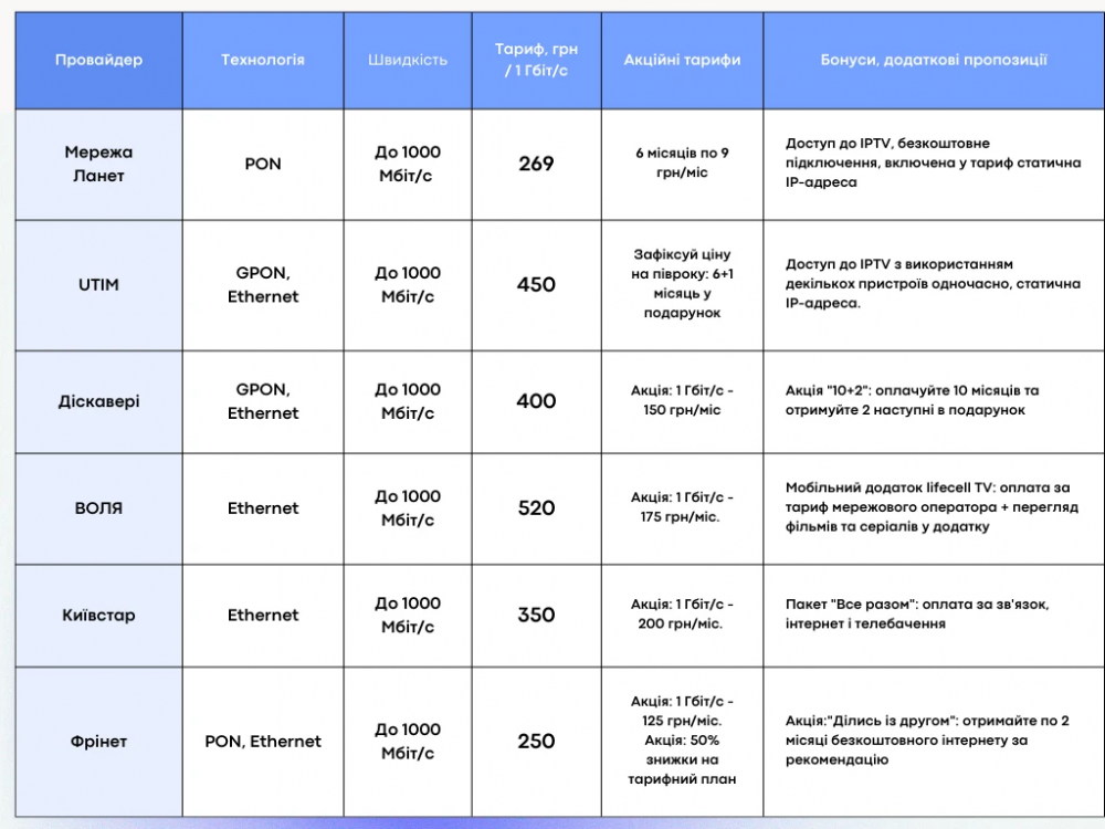 У місті працює декілька провайдерів, кожен із яких має свої сильні сторони: хтось пропонує максимальну швидкість, хтось робить акцент на автономності чи розширених можливостях для приватних домогосподарств, а хтось оптимізує інтернет тарифи під базові потреби. У таблиці нижче ви побачите ключові технічні параметри, порівняння додаткових послуг та особливостей покриття, щоб вибрати оптимальний варіант серед різних провайдерів інтернету.