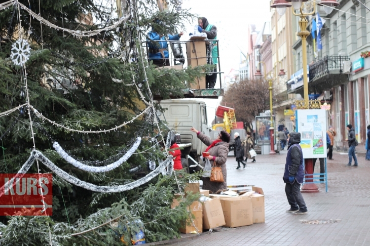 Сьогодні комунальники почали чіпляти на ялинку додаткові прикраси, а також поставили біля неї картонні коробки з надписом "подаруй ялинці іграшку".
