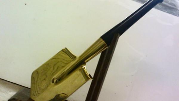 Виріб виконаний в розмірах, аналогічних тим, в яких виробляються звичайні городні лопати, однак виготовлений з золота.