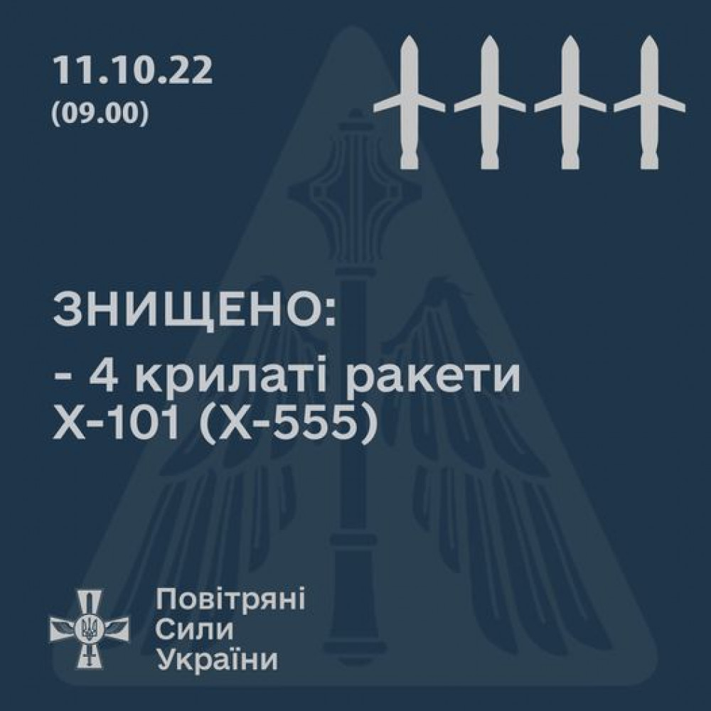 По території України було випущено ракети типу Х-101/Х-555. Близько 9.00 чотири ракети знищено силами та засобами Повітряне командування "Південь". До бойової роботи по крилатих ракетах задіяно авіацію, зенітні ракетні війська, а також мобільні вогневі групи Повітряних Сил ЗС України.