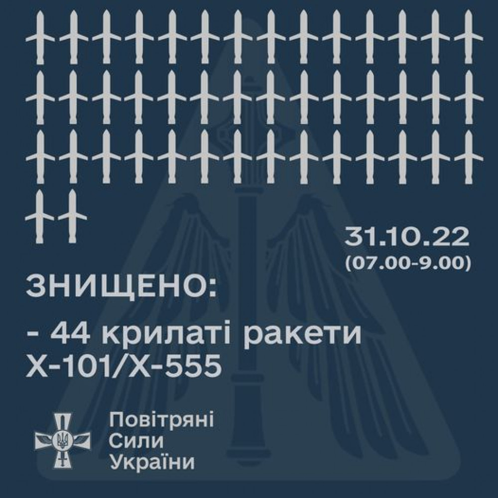 "44 крилаті ракети було знищено силами та засобами Повітряних Сил у зонах відповідальності Повітряне командування "Центр" – 18, Повітряне командування "Південь" – 12, Повітряне командування "Схід" – 9, Повітряне командування "Захід" Повітряних Сил ЗС України – 5!",- йдеться у повідомленні.