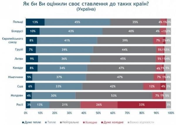 Вразили дані дослідження, які стосувались Росії. Відтак, майже 33% українців її ненавидять (відносяться дуже холодно), 26 % просто не люблять (відносяться холодно), а от 16 % наших громадян, навіть попри військову агресію та війну на Сході досі продовжують любити Росію (теплі відчуття).