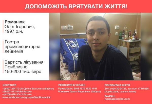 Допомоги потребує 19-річний Олег Романюк. В хлопця важкий рецидив гострої промієлоцитарної лейкемії з дислокацією 15-17 хромосоми. Іншими словами, у Олега рак крові.