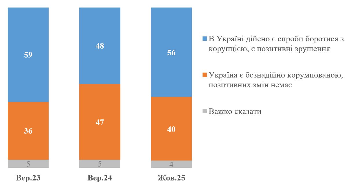 Київський міжнародний інститут соціології (КМІС) оприлюднив результати всеукраїнського опитування громадської думки, проведеного з 19 вересня по 5 жовтня 2025 року. Дослідження показало, що більшість українців (56%) вважають — у країні є реальні спроби боротися з корупцією.