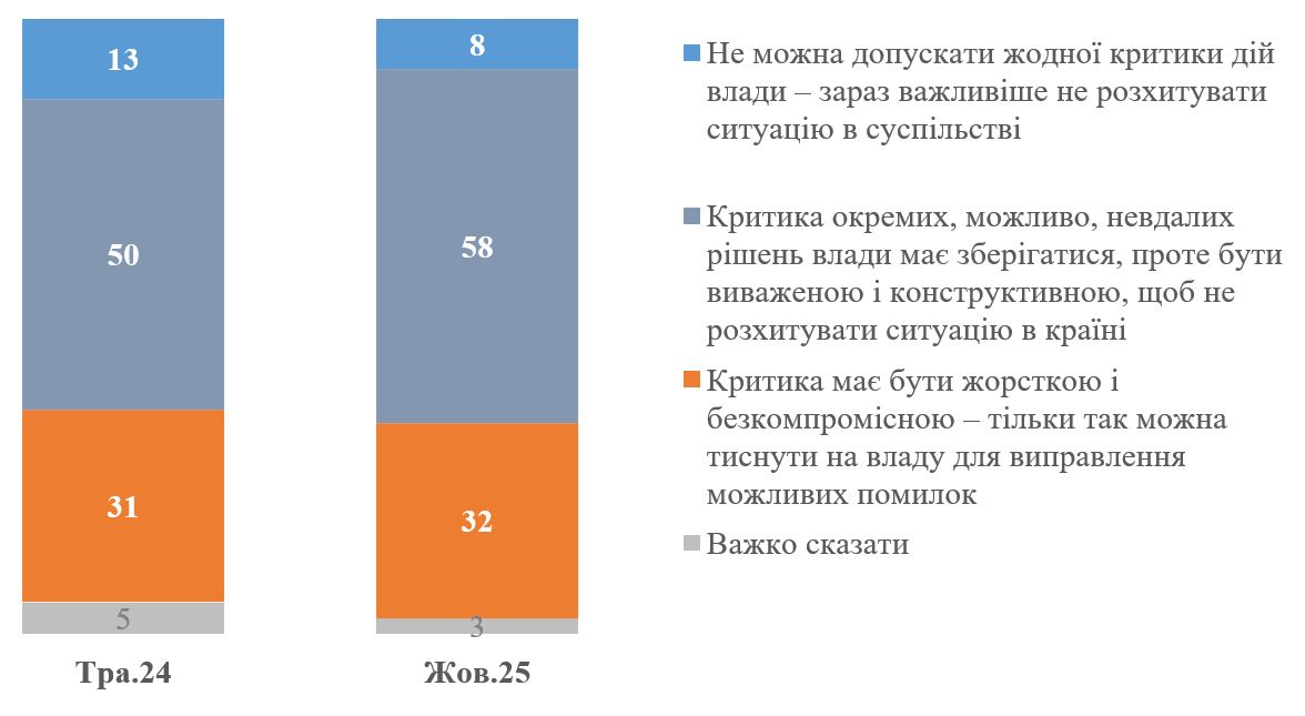 Більшість із тих, хто підтримує право на критику (58%), наголошують, що вона має бути «виваженою і конструктивною, щоб не розхитувати ситуацію в країні». Ще 32% виступають за більш жорстку і безкомпромісну критику.