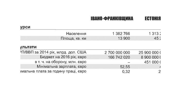 За підсумками 2014 року вартість створеного валового внутрішнього продукту (ВВП) Естонії становила 25,9 млрд. дол. США, в тому числі — 12 348,08 дол. на душу населення. А валовий регіональний продукт (ВРП) Івано-Франківщини оцінювався лише в 2,7 млрд. дол. США. Тобто ми виробили майже вдесятеро менше товарів і послуг.