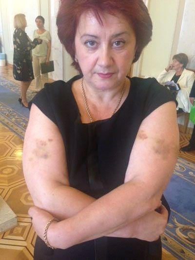 Сама Ольга Сікора сьогодні на брифінгу в парламенті продемонструвала синці, які в наслідок застосування грубої фізичної сили до неї охоронцями Азарова під час її спроби потрапити на зустріч прем’єра з працівниками ТзОВ “Карпатнафтохім”, пишуть "Вікна"