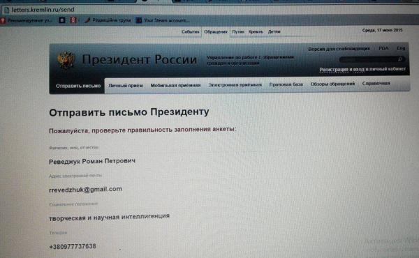 І знову безсонна ніч! Вже третій день нема зв’язку з товаришами котрі в Широкіно, востаннє так і обірвався зв’язок в гучному шквалі. З Богом, але я вперше в своєму житті зайшов на сайт Кремля... Кажуть "Проба грошей не коштує", можливо хтось посміється з моєї наївності, але зробив це з вірою! Вже 16 з моїх товаришів спочивають, вони вже ніколи не скажуть мені "братан привєт"! Але вони приходять до мене в снах, після того як перечитую одного з них передсмертні смс з Донецького аеропорту! За цей рік, я дізнався що таке стиснуло серсе - ця війна заставила мене плакати! Думайте про мене що хочете, але на такий вчинок штовхнула мене ця безсонна ніч!? - наголосив активіст.