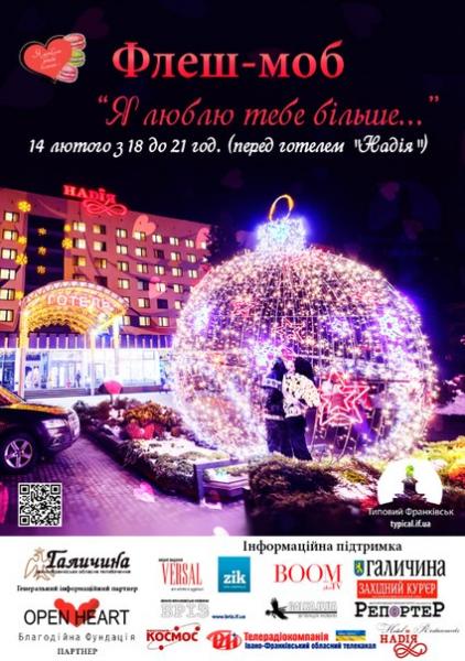 14 лютого з 18:00 до 21:00 перед готелем “Надія” відбудеться флеш-моб поцілунків до Дня закоханих “Я люблю тебе більше…”, метою якого буде допомога пораненим солдатам на Сході України. Символічна пожертва – 20 грн. з кожної пари учасників. Також кожен бажаючий зможе підписати листівку з побажаннями для наших героїв-захисників.