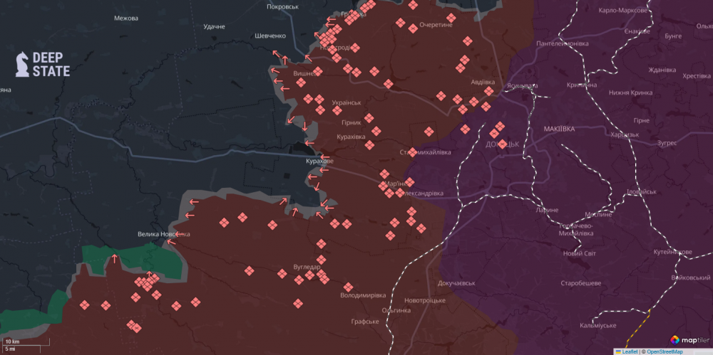 Росіяни окупували два села під Покровськом та Кураховим. Крім того, ворогу просунувся біля восьми населених пунктів на чотирьох напрямках — куп'янському, покровському, курахівському, времівському. Також ідуть бої на околицях Курахового. Про це повідомляють аналітики DeepStat.