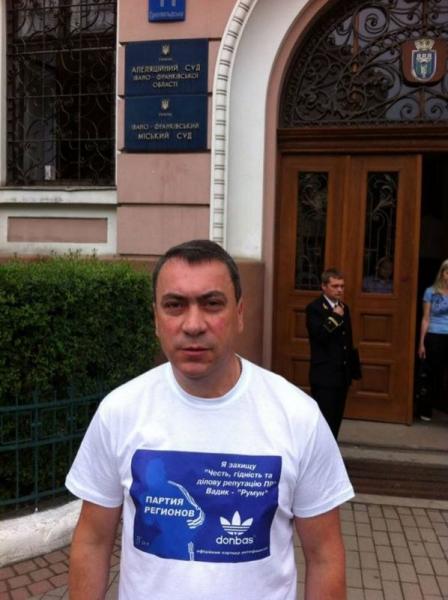 "Я захищу "Честь, гідність і ділову репутацію Партії Регіонів" Вадик-"Румун", — із таким написом на футболці прийшов сьогодні до суду депутат Івано-Франківської обласної ради, лідер фракції ВО "Батьківщина" Юрій Романюк.
