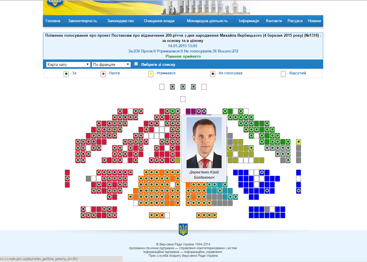 Підтримали її й практично всі присутні на засіданні народні обранці з Прикарпаття. Єдиним виключенням став Юрій Дерев’янко, котрий перебуваючи в цей день в «залі під куполом» та голосуючи за інші законопроекти, не підтримав дану постанову. Тож цілком пустопорожньо виглядають заяви Ю.Дерев’янка, який критикує інших нардепів, які не підтримали закон «Про акціонерні товариства», а сам не голосує за відзначення 200-річчя з дня народження автор національного гімну України.