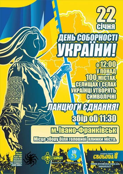 22 січня з нагоди 98-ої річниці Дня Соборності України Всеукраїнські громадські організації «Сокіл» та «Студентська Свобода» вже традиційно організують акцію «Ланцюг Єднання» у понад 100 населених пунктах України.