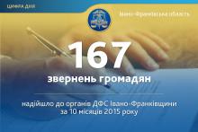 З початку року до Головного управління ДФС у Івано-Франківській області надійшло 167 письмових звернень громадян, що на 13 звернень менше, ніж за відповідний період 2014 року, з них 162 заяви та 5 скарг.