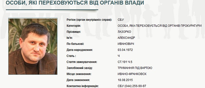 “Особи, які переховуються від органів влади О.Лазорко звинувачується по частині п’ятій статті 191, зник у місті Івано-Франківськ 18.08.2015 року”, — йдеться у повідомленні, передає УНН з посиланням на прес-центр Міністерства внутрішніх справ.