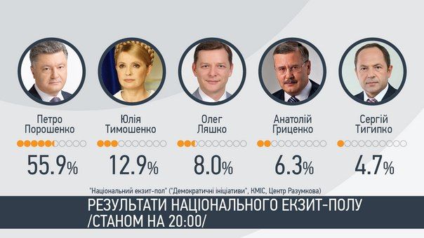За першими результатами національного екзит-полу Петро Порошенко виграв Президеньскі вибори у першому турі.