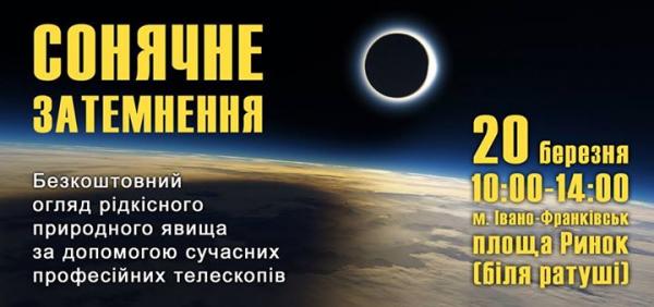 У п’ятницю, 20 березня, кожен іванофранківець зможе спостерігати сонячне затемнення із сучасних професійних телескопів, які розташують на площі Ринок біля Ратуші.