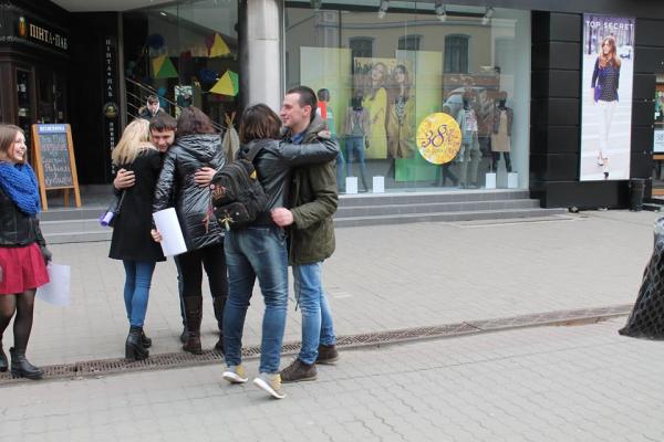 Дівчата з радістю дарували обійми всім перехожим. Фотографії з флешмобу виклав у мережі Фейсбук Євген Мандрик.