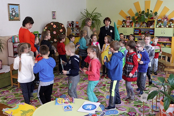 Зокрема, такий урок пройшов у садочку «Веселка» в обласному центрі. Для вихованців старшої групи «Сонечко» тема дорожньої грамоти вже не є новою, до того ж дітки з вихователями завчасу готувалися до зустрічі з поліцейськими – вивчали вірші та пісеньки про Правила дорожнього руху.