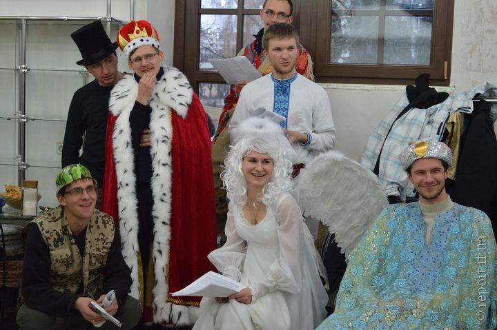 «Це хлопці з духовної семінарії імені Священномученика Йосафата, – розповідає Христина. – У мене там знайомий, отець Руслан П’яста, прийшла, кажу – така є ідея, але людей поки що бракує. А він через тиждень телефонує – є 13 семінаристів. Ще один із них грає чорта. Хлопці так бідкалися з цього приводу, а потім себе заспокоїли – хоч персонажі їм випали негативні, але справу вони роблять добру».