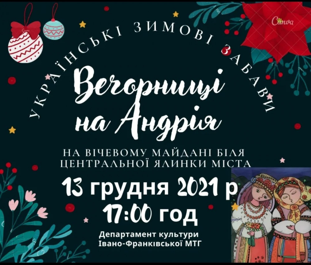 13 грудня о 17.00 на Вічевому майдані біля центральної ялики міста відбудеться театралізоване дійство - українські зимові розваги "Вечорниці на Андрія".