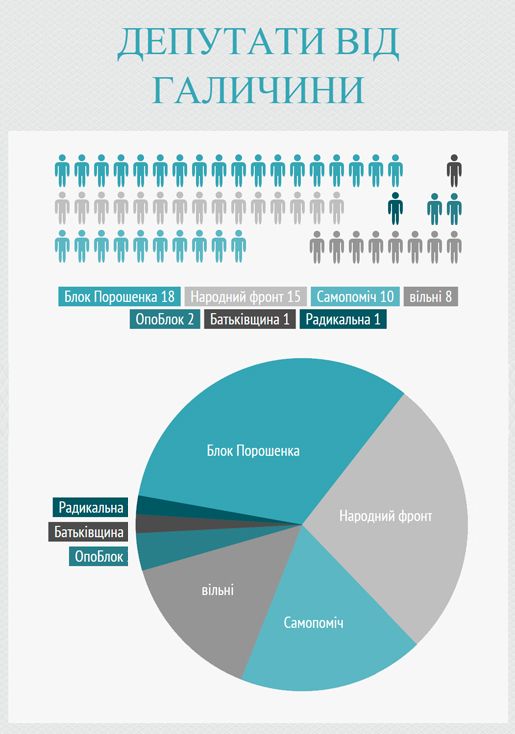 З того два з половиною десятки пройшли в одномандатних округах краю, решта — за партійними списками. Найбільше мажоритарників-галичан пройшли у Раду за підтримки Блоку Петра Порошенка (БПП), а в партійних списках кількісне лідерство належить «Народному фронту» та «Самопомочі».