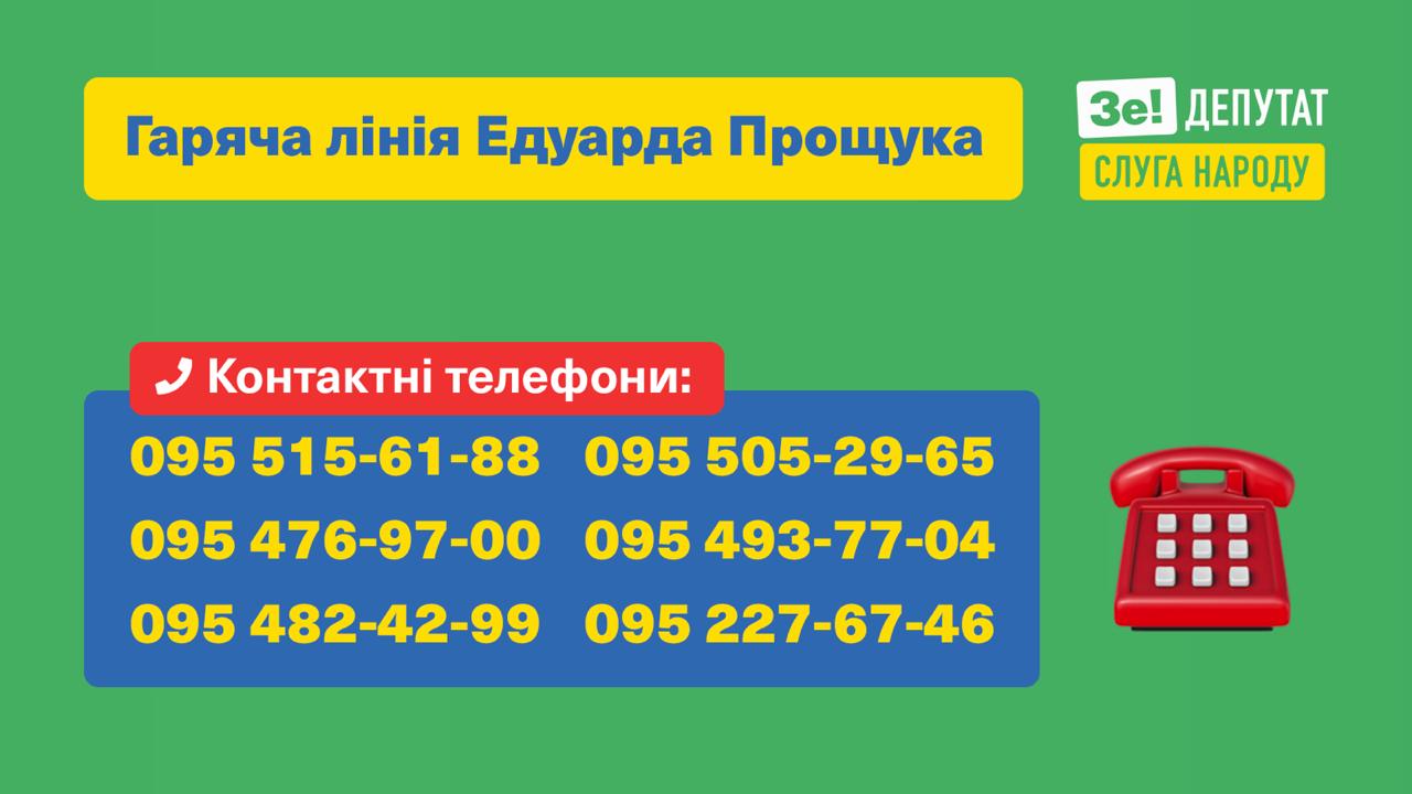 Контактні телефони гарячої лінії: 095 515 61 88, 095 476 97 00, 095 482 42 99, 095 505 29 65, 095 493 77 04, 095 227 67 46. За ними всі охочі зможуть отримати інформацію про Едуарда Прощука зі «Слуги народу», повідомити про проблеми свого населеного пункту чи висловити свої пропозиції з розвитку регіону.
