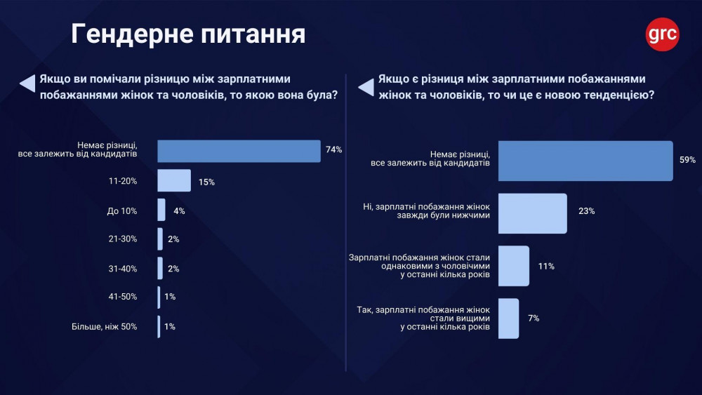 За даними опитування, три чверті роботодавців не відстежують гендерну рівність у зарплатах і вважають, що чоловіки та жінки мають однакові фінансові очікування. Лише близько 20% компаній визнають, що різниця існує. Найчастіше жінки погоджуються на оплату на 11–20% нижчу за той самий обсяг роботи, що майже відповідає офіційній оцінці гендерного розриву в Україні — близько 18%.