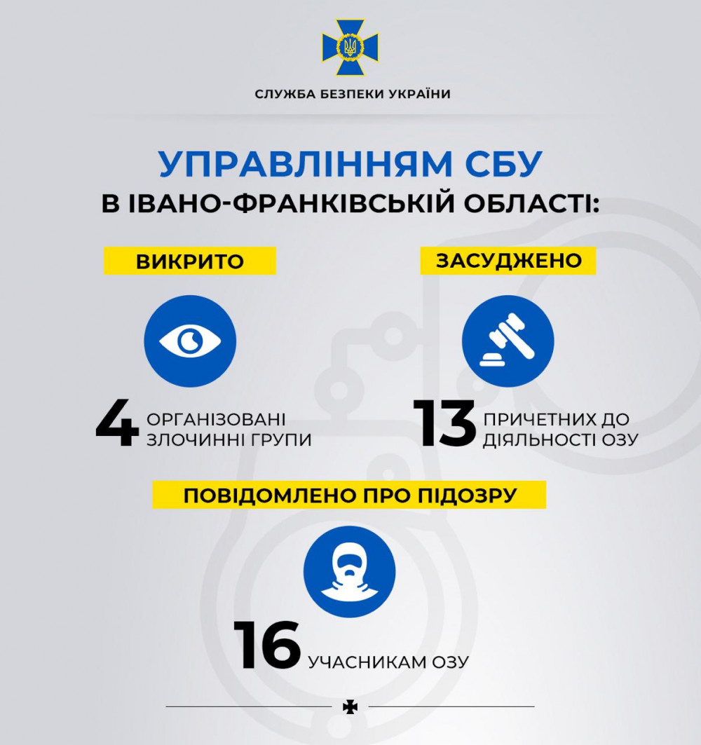 У 2020 році за матеріалами Управління СБУ в Івано-Франківській області шістнадцяти особам повідомлено про підозру у вчиненні злочинів у складі організованих злочинних груп.