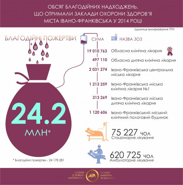Для порівняння, у сусідніх Чернівцях у 2014 році всі заклади охорони здоров’я зібрали в сумі лише 7,5 млн грн благодійних надходжень, а в Тернополі – 5,6 м