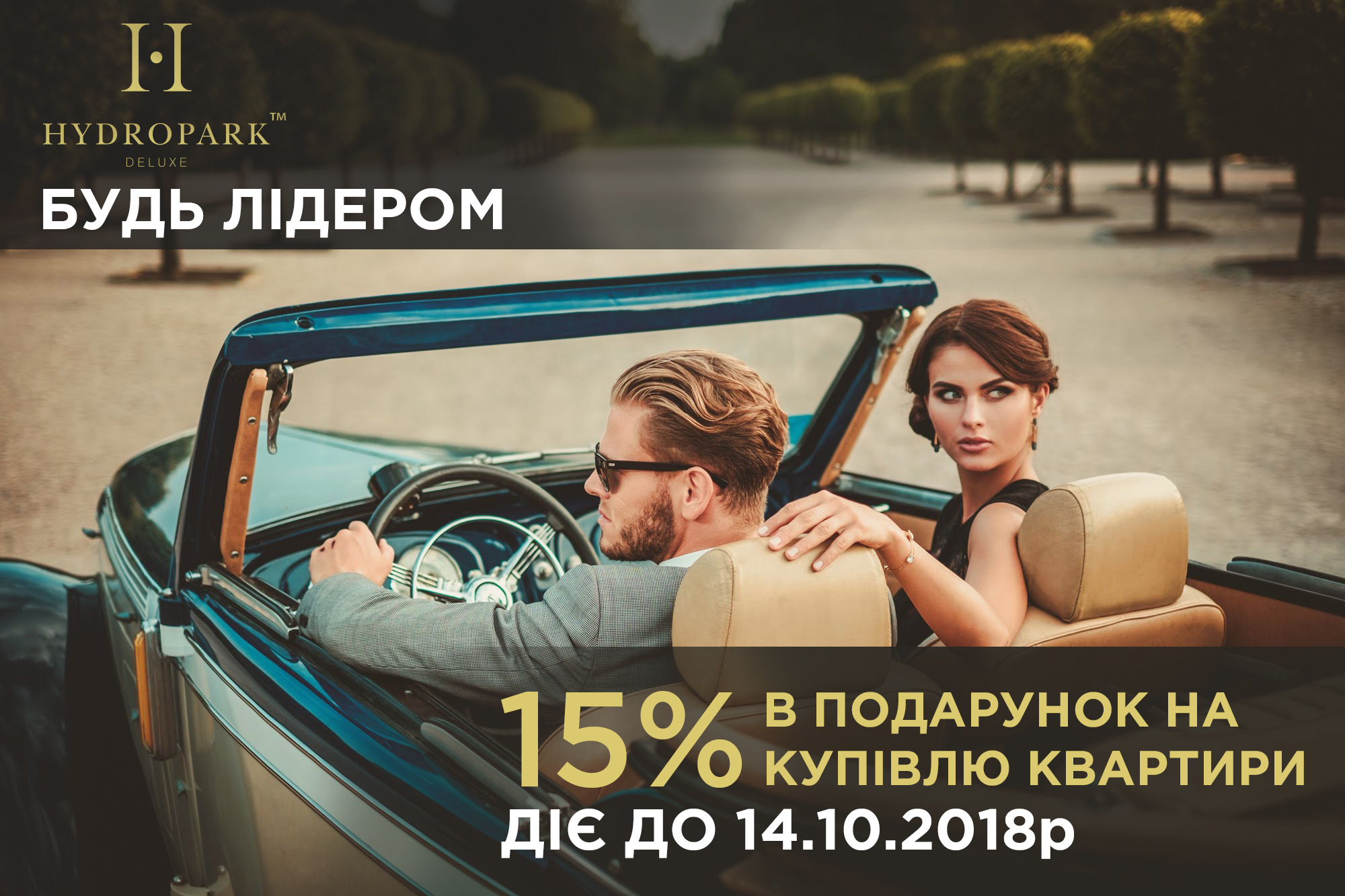 Один з небагатьох, а може і єдиний житловий комплекс класу "Еліт" в такій комплектації й з демократичними цінами. «HydroPark DeLuxe» - Будь лідером. 15% в подарунок на купівлю квартири. Пропозиція дійсна до 14.10.2018 р.