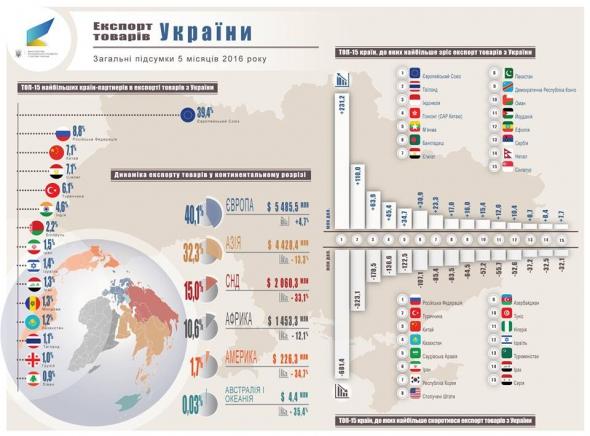 За перші 5 місяців року Україна експортувала товарів на 13,7 млрд доларів. Найбільше продавали закордон харчів. Частка продукції агропромислового комплексу та харчопрому в експорті складає 41,3%. Ще 22,8% - металургічна продукція. Машинобудівельних товарів експортували 12,2%.