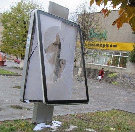 Обстеживши об’єкт та прилеглу територію правоохоронці не помітили нічого підозрілого, тому вирішили повернутися на точку перебування службового транспорту. По маршруту прямування, на вулиці Бельведерській, правоохоронці побачили, як невідомий чоловік трощить рекламний щит. Стараннями молодика скло на сіті-лайті було розбито.