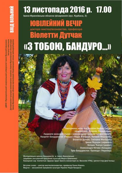 Довідка: Дутчак Віолетта Григорівна — українська бандуристка, музикознавець, педагог. Навчалася в Івано-Франківському музичному училищі імені Д.Січинського, Львівській консерваторії імені М.Лисенка за спеціальністю «бандура». В 1990 закінчила Львівську консерваторію клас В. Герасименка. Керівник Ансамблю бандуристів Прикарпатського національного університету імені Василя Стефаника. Керівник квартету бандуристів «Ґердан».
