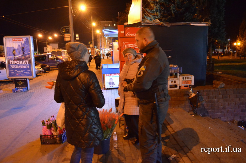 У двориках і бічних вулицях центру теж нікого підозрілого. Приходимо на стометрівку: там, незважаючи на пізній час, життя бурлить, зокрема і продаж квітів. Тут цього робити не можна взагалі, а ще й первоцвіти. Вартові складають протокол. Кажуть, що вже проганяли цих торговців сьогодні, а вони повернулися.