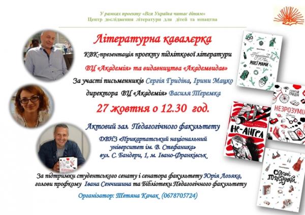 27 жовтня о 12:30 год. в Актовій залі Педагогічного факультету (м.Івано-Франківськ, вул.Ст.Бандери 1) у рамках проекту Центру дослідження літератури для дітей та юнацтва «Вся Україна читає дітям» відбудеться КВК-презентація проекту підлітової літератури "Літературна кавалєрка" за участі письменників Сергія Гридіна (м.Рівне), Ірини Мацко(м.Тернопіль), директора ВЦ «Академія» Василя Теремка (м.Київ).