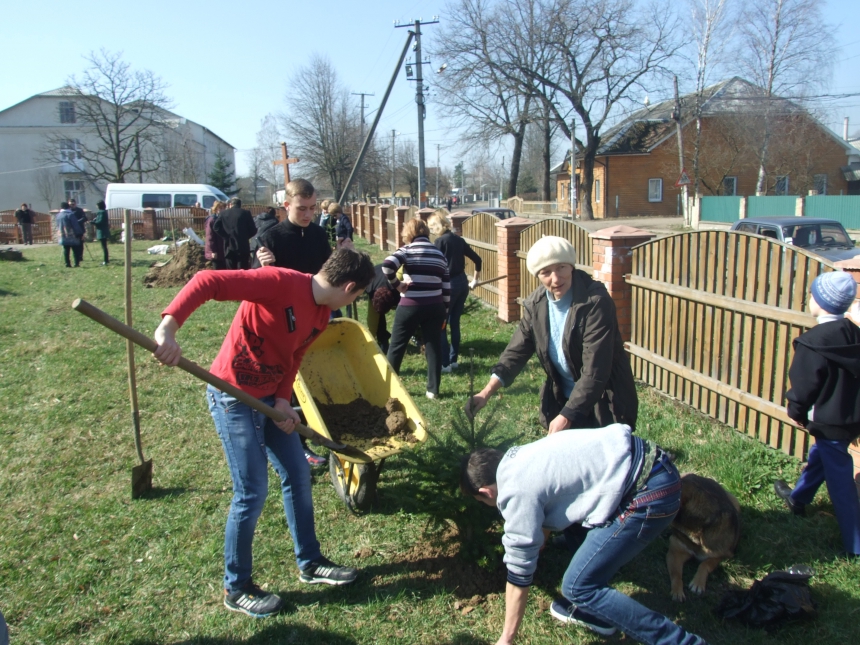 Дорослі та молодь висадили на подвір’ї Народного дому та поблизу могили Січових стрільців алею хвойних і декоративних дерев та кущів, які привезли працівники ДП «Калуський лісгосп».