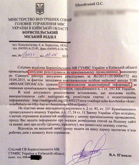 У статті повідомлялось, що у березні 2015 року суд дав санкцію Міністерству внутрішніх справ на позапланову ревізію «Нафтогазу України» в рамках кримінального провадження щодо можливого незаконного заволодіння «нафтогазівського» бензину на 450 мільйонів гривень фірмою «ГазУкраїна-2020» ще у 2012 році.