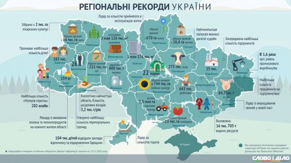 Не відстають і регіони, що традиційно є найбільшими постачальниками сільськогосподарської продукції: у Кіровоградській області минулоріч зібрали урожай із 744 тис. гектарів олійних культур, на Донеччині виростили найбільше поголів’я свиней (84,7 тис.), а на Вінничині надоїли найбільше молока (800 тис. тонн).