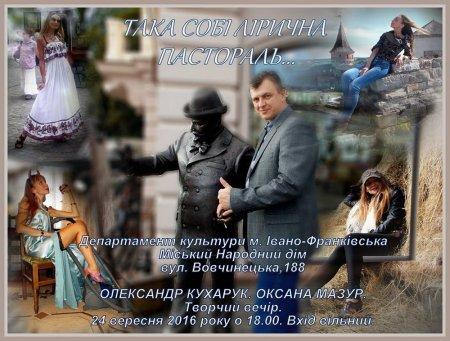 24 вересня о 18.00 год в приміщенні Міського Народного дому (вул..Вовчинецька,188) відбудеться мистецький вечір «Лірична пастораль» за участю поетесси Оксани Мазур(м.Львів) та поета-аматора Олександра Кухарука.