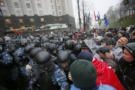 Частина молодиків із масками на обличчі запалюють фаєри, кидають монети, цеглину. Петра Порошенка, який намагався заспокоїти, штовхали і не давали слово. Провокатори штурмують "Беркут". Правоохоронці нічого не роблять.